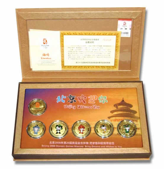 ANOTHER DONATION! Hard to find coin set "Fuwa", Games Mascots – Bring Dreams and Wishes to You. The coins are gold coated copper, 40 millimeters diameter, all in original protection boxes. The set is in the original box and comes with a Chinese Certificate. 80,000 sets have been issued, as they were mostly presents for selected people not many sets are found at the market. …Each medallion of a diameter of 40 millimetres ( gold – plated copper ) carries respectively "Beibei", Jingjing", "Huanhuan", "Yingying", "Nini" – Prosperity, Happiness, Passion, Health and Good Luck….. …advanced technique, this set carries an anti-counterfeit label……serial numbered." Each coin is encased in plastic. Pier gave these coins to me to help me out...Find out more about Pier in Meet "The Swappers" section.